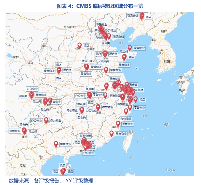 我們以A1優先級的CMBS與主體信用利差為例,不同資產類型和不同城市的利差皆有不同。其中辦公物業、混合類、酒店、零售物業、物流倉儲的平均利差約為36、14、45、7、22 bp;而我們只看重點城市北京、上海、深圳的話(多地為多地多個資產,平均12 bp)平均利差約為22、40、40bp。綜合而言,從利差角度,市場對核心城市(北上深)的辦公物業、酒店、物流倉儲資產認可程度較好,高于總體平均利差,而混合類和零售物業類資產雖然占比很高但方差也較大。
