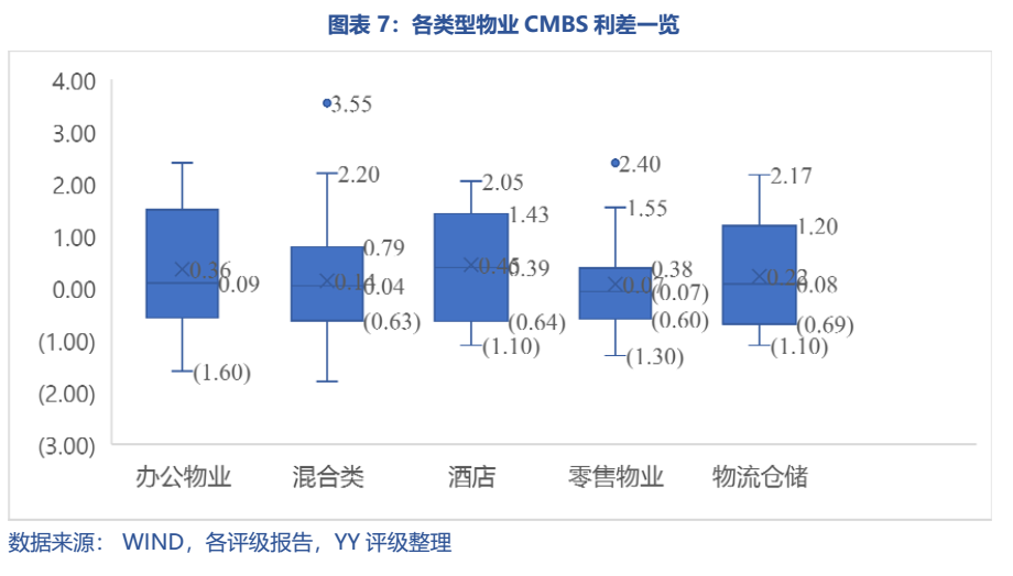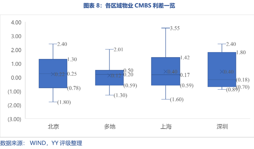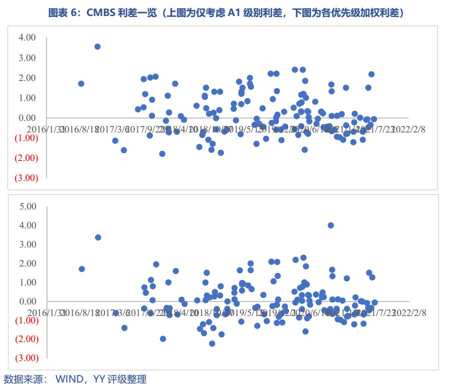 整體而言,取CMBS實際發行主體相近時間發行的3年期左右公司債或中期發行票面利率 – CMBS發行票面利率所得利差,體現CMBS的抵押和增信措施對債項的增信效果(或至少一級投資者認可的增信效果),一般而言>0的程度越高表示資產的增信程度越好。