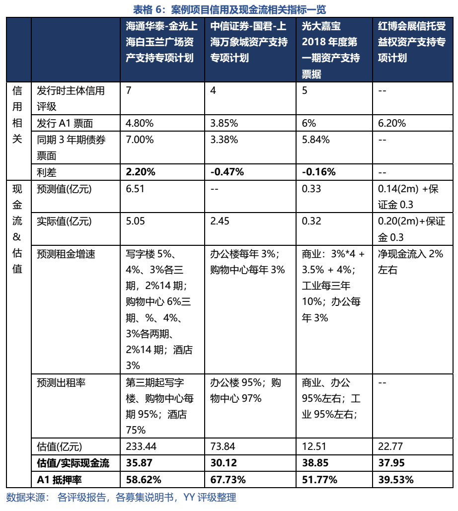 概括而言,表4的指標設計成維度定性跟蹤指標,即主體財務以反映增信風險、主體經營(品牌)以反映設計和管理風險、各級城市規劃也反映位置+競爭+人口趨勢問題以及用行業分布、期限結構來跟蹤租戶組合風險,同時關注一些可能的非經常性支出問題,如稅制改革(房地產稅)和更新改造需求(五角場萬達為10年左右后改造)。