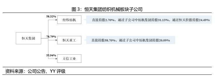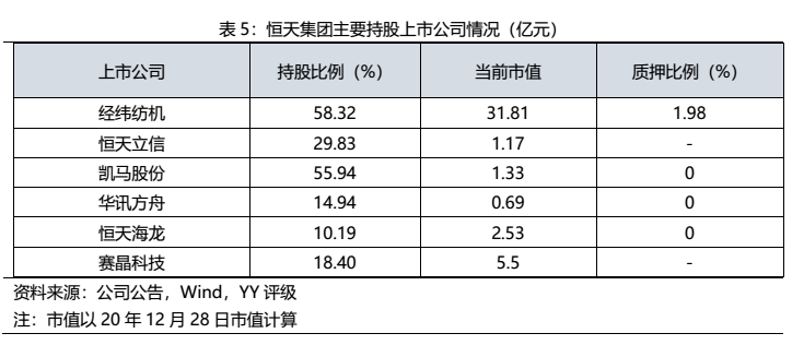 恒天集團(tuán)屬于控股型公司,旗下子公司眾多,境內(nèi)外控股上市公司3家,分別是A股上市公司經(jīng)緯紡機(jī)(持股比例58.32%)、B股上市公司凱馬股份(持股比例31.60%)和H股上市公司恒天立信(持股比例55.94%);參股上市公司華訊方舟(持股14.94%)、恒天海龍(持股10.19%)、賽晶科技(持股18.56%)。公司還是中融國際信托有限公司的大股東。除母公司外,經(jīng)緯紡機(jī)和中融信托也作為發(fā)債主體獨立發(fā)債。