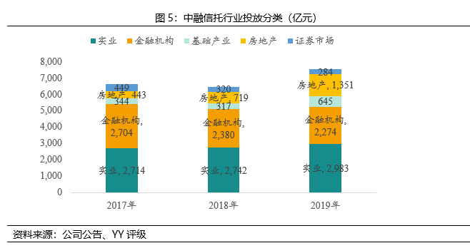 從行業(yè)投向來看,主要投向為實業(yè)和金融機(jī)構(gòu),至2019年末分別占比39.0%、29.7%。另外,投向房地產(chǎn)行業(yè)的占比2019年也快速提升,達(dá)到17.7%。