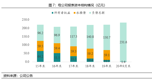 雖然資產(chǎn)規(guī)模變化不大,但由于歸母凈利潤持續(xù)虧損,資本結(jié)構(gòu)上發(fā)生了巨大的變化,所有者權(quán)益急劇縮水,而負(fù)債規(guī)模大幅攀升。15年末至20年9月末期間,由于持續(xù)虧損,母公司報表所有者權(quán)益(不含永續(xù)債)從64.2億元縮水至1.4億元,同時20年下半年2只“5+N”的永續(xù)債到期(若不償還則利率跳升300BP),合計約60億元。負(fù)債總額(不含永續(xù)債)期間從96.2億元增長至231.6億元,其中有息債務(wù)從80.4億元增長至154.7億元。另外,20年三季度在永續(xù)債減少的同時,其他應(yīng)付款增加了約50億元,而合并報表其他應(yīng)付款變動不大,推測是母公司占用了子公司款項以應(yīng)對永續(xù)債到期。