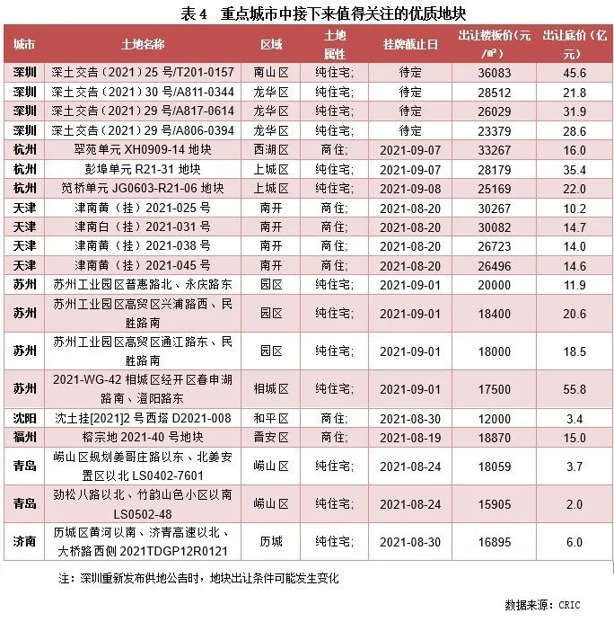 值得注意的是,接下來杭州、蘇州、天津等城市均有多宗優質地塊即將結束掛牌;尤其是杭州,起拍價超過2萬元/㎡的土地就有9宗之多,其中不乏上城區筧橋、西湖翠苑這種起拍價超過2.5萬/㎡的優質地塊,但由于地塊限價較寬松,預期利潤率相對較高,加之其又處于核心板塊,這些優質地塊的競拍仍將延續高熱度,房企可重點關注,但要注意的是,政府調控加碼之下,鑒于房價走勢趨于平穩,盈利空間一定程度上被鎖死,競拍時切莫盲目追高。
