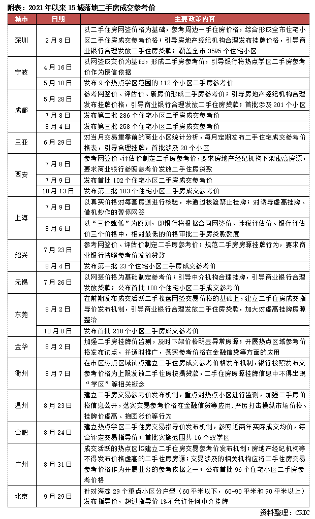 二手房成交參考價成為本輪房地產調控的重要措施。截至目前,深圳、寧波、成都等15個城市相繼落地二手房成交參考價,主要涉及以下三方面內容: