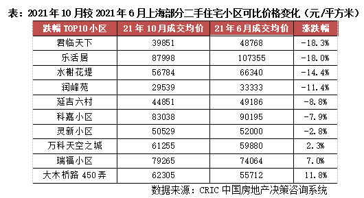 而在指導價出臺后,上海二手房價格則由漲轉跌。剔除零星成交的二手住宅小區,上海2021年10月二手住宅小區售價較2021年6月溫和下跌,可比價格跌幅中位數、平均數分別為-6.3%和-4.7%。其中,可比價格跌幅在10%-20%的二手房小區占比多達37.2%,其次為可比價格跌幅在0%-10%的二手房小區,占比約31.8%,另有31%的二手房小區可比價格仍有所上漲。