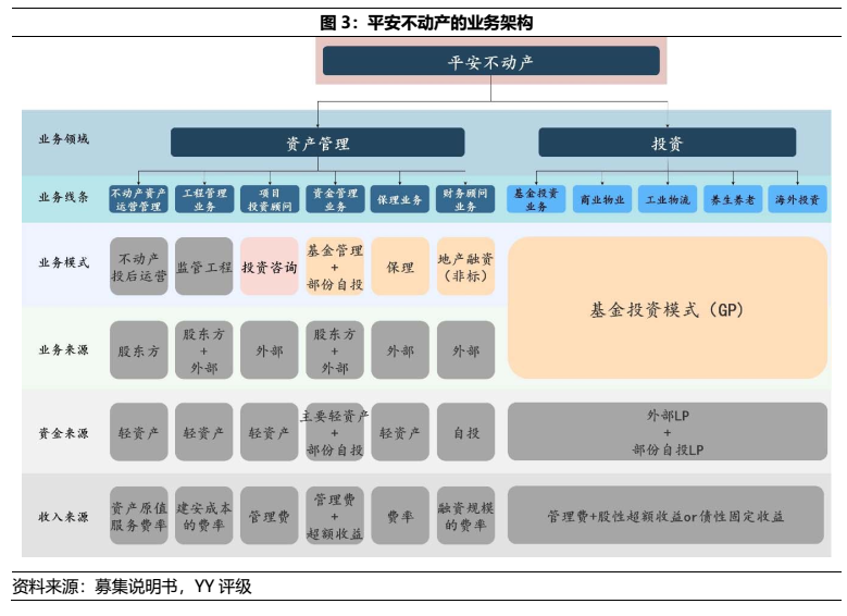 平安不動產有限公司由平安系相關企業100%控股,分別被平安人壽、平安財險、平安科技和平安融資租賃等公司持股。作為中國平安的不動產投資運營平臺,平安不動產的主要業務是基于搭建平安系的不動產投資基金管理業務而設。
