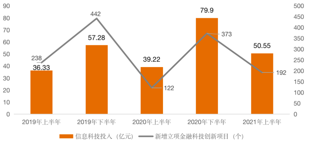 在金融科技領(lǐng)域取得顯著成就的同時(shí),招行面臨著創(chuàng)新轉(zhuǎn)化能力下滑的問題。零壹智庫通過招行半年報(bào)與年報(bào)中披露的信息科技投入與金融科技創(chuàng)新項(xiàng)目累計(jì)立項(xiàng),計(jì)算得出各期科技投入與新增立項(xiàng)數(shù)量。2021年上半年,在科技投入與上兩年同期相比有所增加的情況下,招行新增立項(xiàng)金融科技創(chuàng)新項(xiàng)目僅為192個(gè),轉(zhuǎn)化效率有所下降。在加大科技投入的同時(shí),提高創(chuàng)新轉(zhuǎn)化能力也是招行下半年應(yīng)發(fā)力的重點(diǎn)。