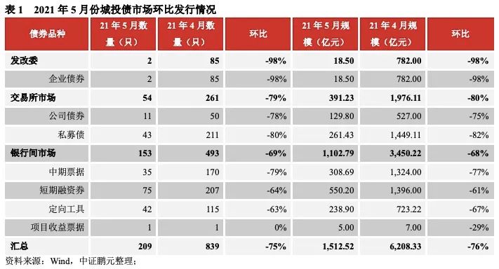 嚴監管下,5月城投債發行大幅下降。2021年5月份,各品種城投債共發行209只,發行規模1,512.52億元,較4月份發行數量和規模環比下降75%和76%。