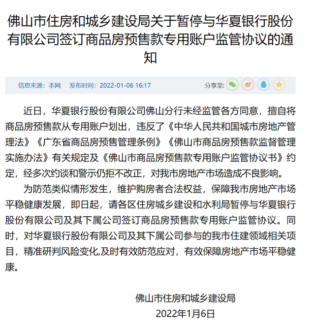 1月6日,華夏銀行佛山分行被佛山市住建局通報(bào),起因是其未經(jīng)監(jiān)管各方同意,擅自將佳兆業(yè)悅峰項(xiàng)目的商品房預(yù)售款從專(zhuān)用賬戶劃出,違反規(guī)定且拒不改正。