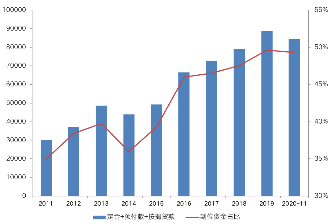 在房企項目開發過程中,銷售回款最重要的資金來源。自2014年以來,銷售回款逐年上升,在房地產開發到位資金的比重也不斷擴大,增速明顯高于其他融資渠道。2020年11月,定金、預收款和個人按揭貸款合計占資金總額的比重為49.3%,基本占據半壁江山。