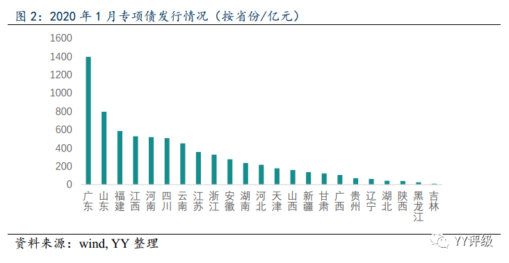 從發(fā)行地區(qū)來看,1月份發(fā)行專項債較多的省份有廣東省(占比19.5%)、山東省(占比11.1%)、福建省(占比8.2%)、江西省(占比7.4%)、河南省(占比7.3%)。從發(fā)行主體來看,除了深圳市、青島市、廈門市為地級市政府,其他發(fā)債主體都是省級人民政府或直轄市人民政府。