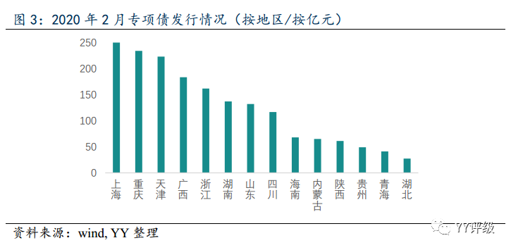 2月份專項債發(fā)行中,上海市、重慶市、天津市三大直轄市領(lǐng)跑,分別占比14.3%、13.4%、12.7%。從發(fā)行主體來看,除了青島市為地級市政府,其他發(fā)債主體都是省級人民政府或直轄市人民政府。