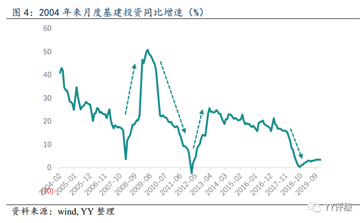 從歷史數(shù)據(jù)來看,基建投資大體上經(jīng)歷了3次增速下跌以及2次強(qiáng)政策刺激。