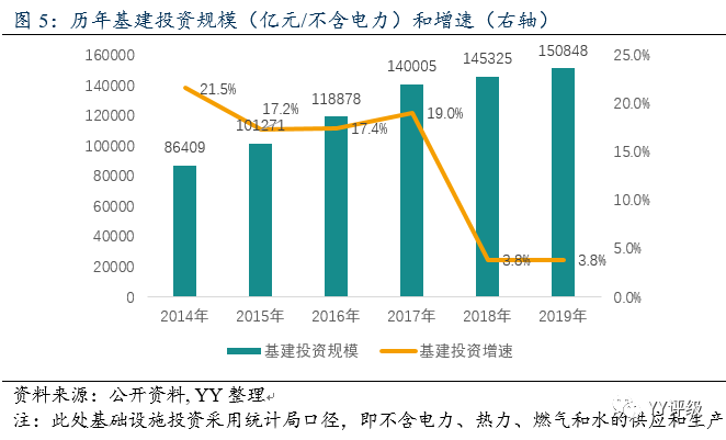 基金資金來源中外資占比很小,2017年、2018年外資實(shí)際到位資金僅290億、305億元,占比分別為0.2%、0.3%,對基建投資的影響基本可以忽略不計。可粗略假定其增長率維持不變,則2019年可到位337億元。