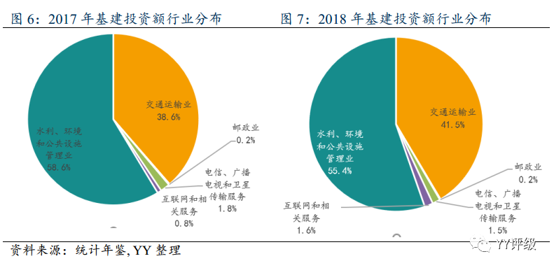 從投資行業(yè)來看,近幾年投資占比最高的還不是說起基建首先想起的交通運(yùn)輸業(yè),而是水利、環(huán)境和公共設(shè)施管理業(yè)。2018年水利、環(huán)境和公共設(shè)施管理業(yè)占比55.4%,不過相比2017年有所降低。交通運(yùn)輸業(yè)投資占比41.5%,相比上年有所提高。郵政業(yè)、電信廣播電視和衛(wèi)星傳輸服務(wù)業(yè)、互聯(lián)網(wǎng)和相關(guān)服務(wù)占比很小,其中互聯(lián)網(wǎng)和相關(guān)服務(wù)占比在2018年增加了1倍。