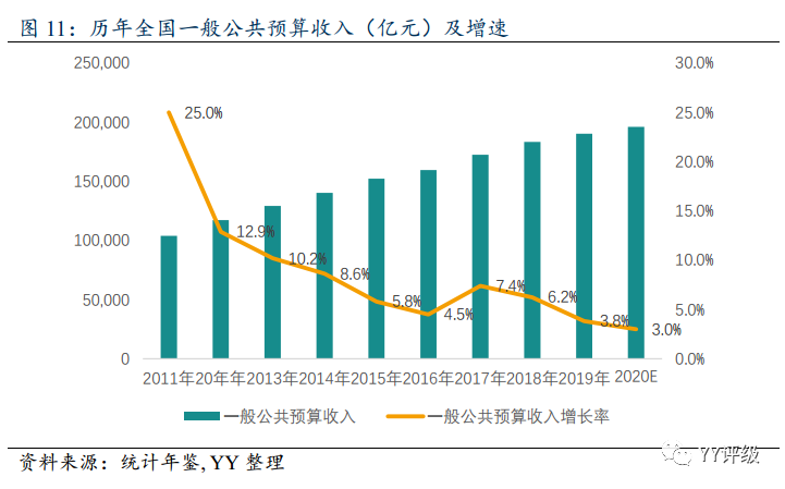 預(yù)算內(nèi)資金主要是來源于一般公共預(yù)算。從總體趨勢來看,一般公共預(yù)算收入維持連年增長,但是增速基本逐年下跌。2019年全國實(shí)現(xiàn)一般公共預(yù)算收入190382億元,同比增長3.8%。考慮到2020年經(jīng)濟(jì)下行壓力較大、為應(yīng)對疫情可能進(jìn)一步降稅,預(yù)計一般公共預(yù)算收入增速將進(jìn)一步降低至3.0%左右,一般公共預(yù)算收入為19.6萬億元左右。