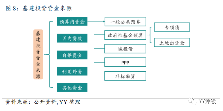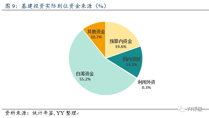 資金能否到位是基建項目能否落地的主要制約因素,基建投資的資金來源分為預(yù)算內(nèi)資金、國內(nèi)貸款、自籌資金、利用外資和其他資金。