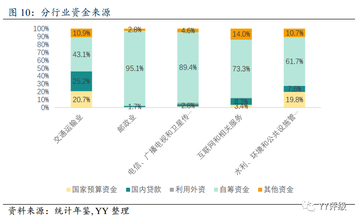 分行業(yè)來看,相對來說,交通運(yùn)輸業(yè)中自籌資金占比低于平均水平,國內(nèi)貸款占比高于平均水平。郵政業(yè)以及電信、廣播電視和衛(wèi)星傳輸服務(wù)業(yè)資金來源基本由自籌資金構(gòu)成,水利、環(huán)境和公共設(shè)施管理業(yè)以及互聯(lián)網(wǎng)和相關(guān)服務(wù)業(yè)中自籌資金占比也很高。不過由于交通運(yùn)輸業(yè)以及水利、環(huán)境和公共設(shè)施管理業(yè)的投資合計占基建投資的95%以上,資金來源結(jié)構(gòu)基本是由這兩個行業(yè)決定的。