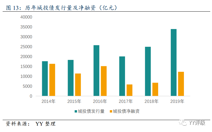 城投債方面,可用于基建投資的資金量主要與城投債凈融資規(guī)模有關(guān)。2019年,城投債發(fā)行數(shù)量超過4千只,融資規(guī)模達(dá)3.39萬億元,總發(fā)行規(guī)模達(dá)到十年來新高。凈融資量8227億元,高于2017年、2018年,低于2015、2016年,總體來說2017年~2019年凈融資規(guī)模是不及2014~2016年的。