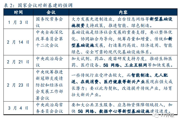我們不僅僅應(yīng)當(dāng)關(guān)注基建的總規(guī)模,更應(yīng)當(dāng)關(guān)注基建的結(jié)構(gòu),基建的總規(guī)模在短期內(nèi)能發(fā)揮較大的作用,而基建的結(jié)構(gòu)才是決定長期的投入產(chǎn)出效率的關(guān)鍵。近期以來,“新基建”一詞在國家層面文件中頻繁出現(xiàn),已經(jīng)成為2020年熱詞,一連串會議極大地強(qiáng)調(diào)了新基建的重要性。