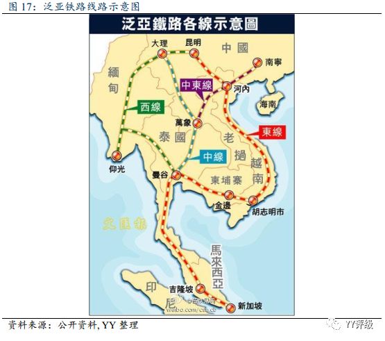 此次云南基建中的重大項目大瑞鐵路、沿邊鐵路、玉磨鐵路、沿邊高速、跨境電網(wǎng)和智能電網(wǎng)基本都直抵中盟腹地的。玉磨鐵路、大瑞鐵路分別為泛亞鐵路中線、細(xì)線的重要組成部分,沿邊鐵路則連接了泛亞鐵路東、中、西線,泛亞鐵路是2010年由亞洲18個國家正式簽署的《亞洲鐵路網(wǎng)政府間協(xié)定》正式確立下來的,是一座連接亞、非、毆三大洲的最大的“橋梁”和通道。