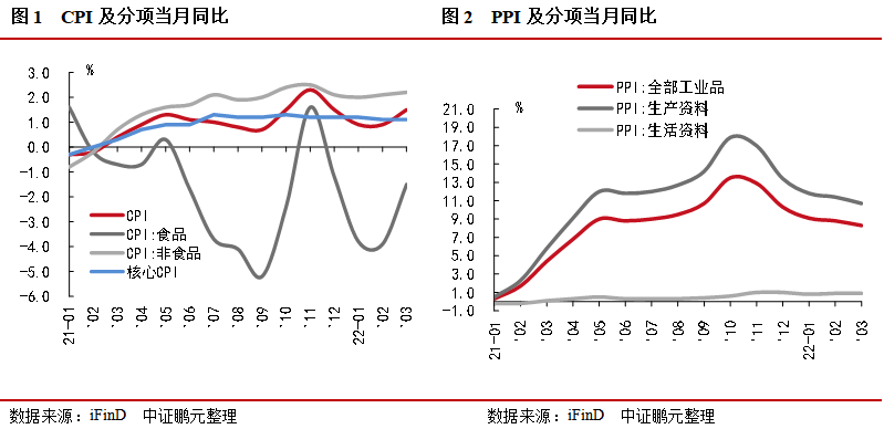 3月,全國居民消費價格CPI同比上漲1.5%,漲幅比上月擴大0.6個百分點,去年價格變動的翹尾因素影響約為0.4個百分點,新漲價影響約為1.1個百分點,扣除食品和能源價格的核心CPI同比上漲1.1%,漲幅與2月相同。CPI環比由上月上漲0.6%轉為持平。從CPI分項環比來看,食品價格由上月上漲1.4%轉為下降1.2%,豬肉價格下降9.3%,受國際小麥、玉米和大豆等價格上漲及國內疫情影響,面粉、食用植物油、鮮菜和雞蛋價格分別上漲1.7%、0.6%、0.4%和0.3%;非食品價格上漲0.3%,其中工業消費品價格上漲1.1%,主要是能源價格上漲帶動,汽油、柴油和液化石油氣價格分別上漲7.2%、7.8%和6.9%。從CPI分項同比來看,食品價格下降1.5%,豬肉價格下降41.4%,降幅比上月收窄1.1個百分點;非食品價格上漲2.2%,漲幅比上月擴大0.1個百分點,影響CPI上漲約1.77個百分點。