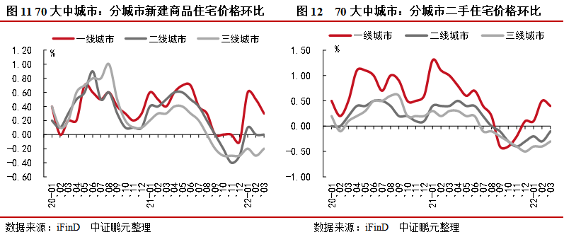3月份,70個大中城市新建商品住宅和二手住宅銷售價格環比分別上漲-0.1%和-0.2%,前值為-0.1%和-0.3%,環比繼續下降。同比分別上漲0.7%、-0.9%,前值為1.2%、-0.3%,同比漲幅繼續回落。