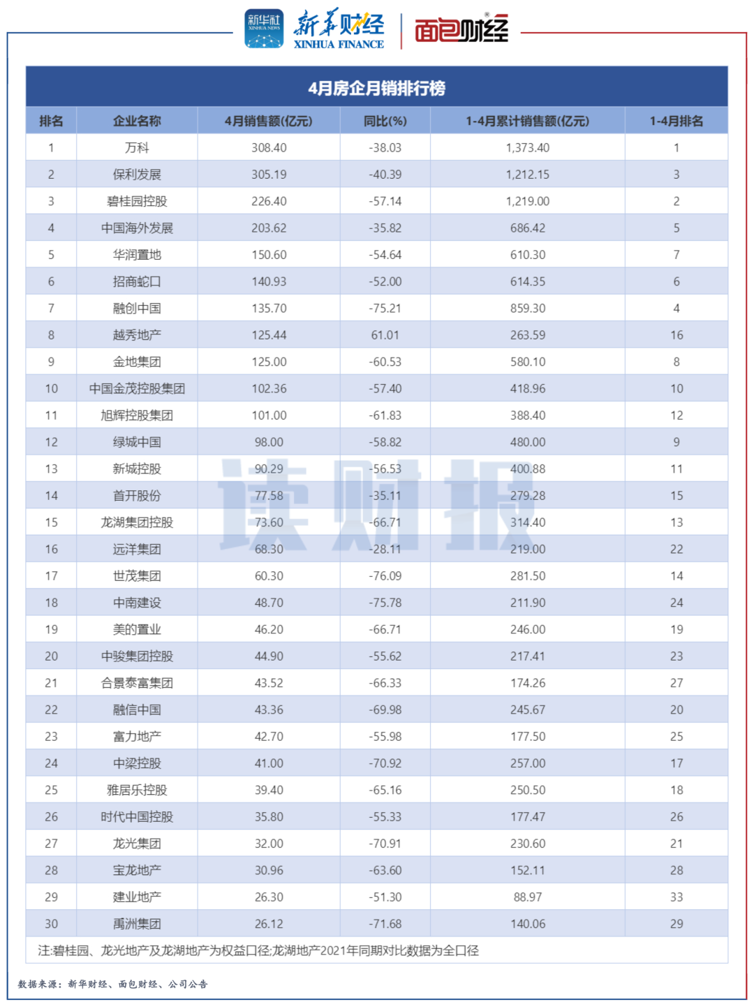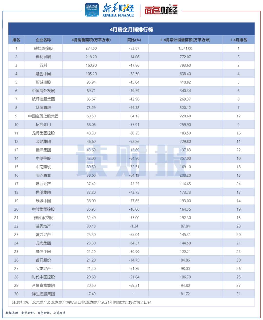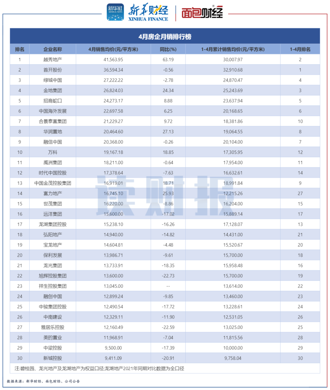 主流上市房企2022年4月銷售數據已經披露完成。新華財經和面包財經研究員在剔除部分數據披露不全的上市房企后,以滬、深、港三大股票交易所39家主要上市房企為樣本,分別統計銷售金額、銷售面積以及銷售均價排名前三十的企業。