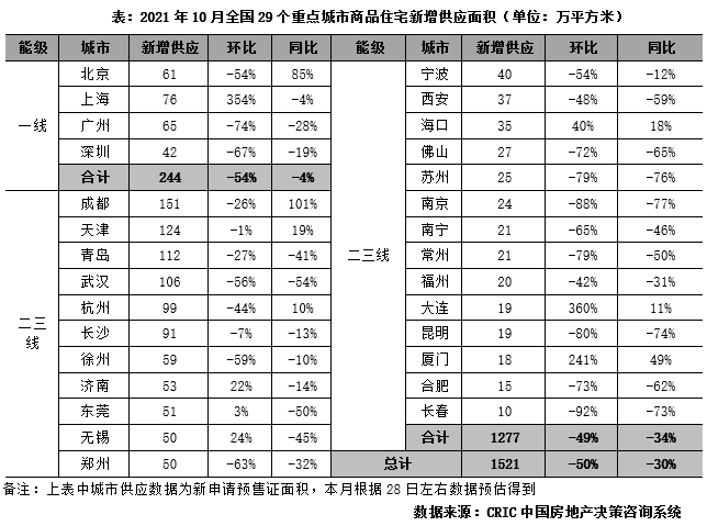 10月,因房地產(chǎn)市場(chǎng)下行加劇,房企推盤積極性回落,本月29個(gè)重點(diǎn)城市預(yù)估新增供應(yīng)面積1521萬(wàn)平方米,環(huán)比“腰斬”,同比下降3成,顯著不及去年同期。