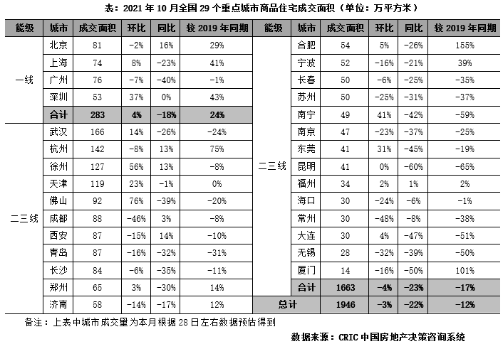 10月,典型城市商品住宅成交熱度延續(xù)低位波動(dòng),基本“見底”,29個(gè)監(jiān)測(cè)城市預(yù)計(jì)成交規(guī)模達(dá)1946萬(wàn)平方米,環(huán)比微降3%,同比降幅有收窄趨勢(shì),下降22%,較2019年同期降幅為12%。