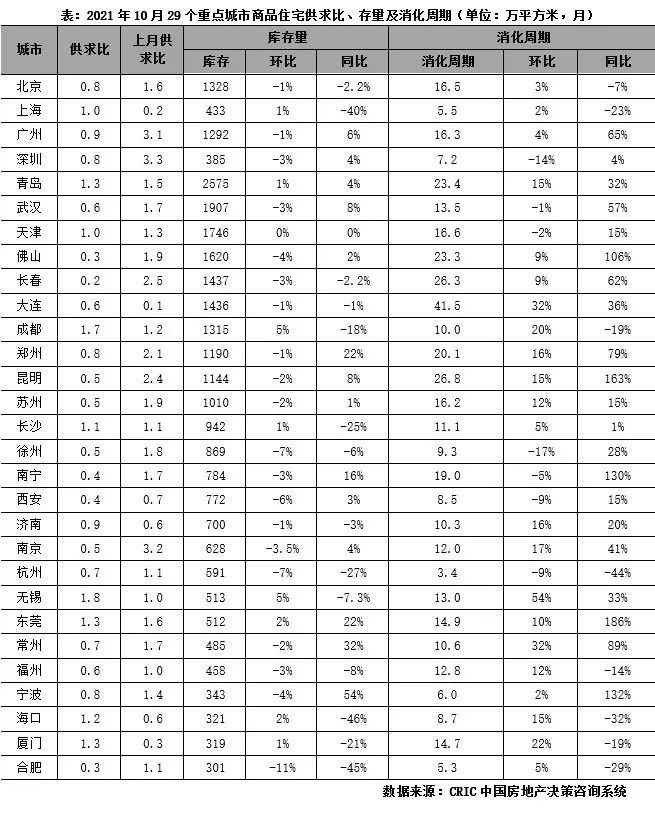 “金九”銷售節(jié)點(diǎn)過后,三四線城市新盤推貨量下滑下,10月熱點(diǎn)城市供應(yīng)環(huán)比下滑較成交更為顯著,故短期呈現(xiàn)供不應(yīng)求。29個(gè)重點(diǎn)城市整體供求比略低于0.8。