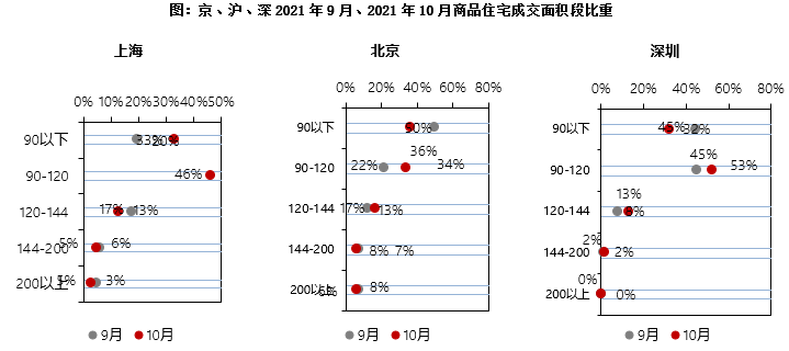 從面積段分布來看,90平方米以下產(chǎn)品占比上海上升14個(gè)百分點(diǎn),北京和深圳分別下降14和12個(gè)百分點(diǎn);90-120平方米產(chǎn)品占比北京和深圳分別上升12和7個(gè)百分點(diǎn);120-144平方米產(chǎn)品占比上海、北京、深圳分別變化-5、4、5個(gè)百分點(diǎn);144-200平方米產(chǎn)品以及200平方米以上大戶型產(chǎn)品成交占比上海和北京均下降3個(gè)百分點(diǎn)。