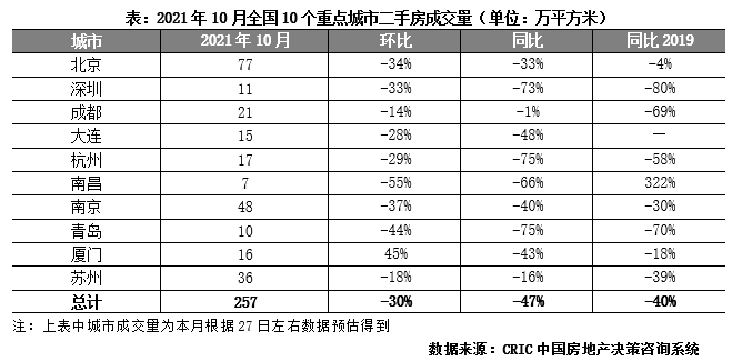 2021年10月,二手房市場(chǎng)整體延續(xù)下行走勢(shì),規(guī)模上環(huán)比再降30%,10個(gè)重點(diǎn)城市共計(jì)成交257萬(wàn)平方米。較去年同期相比規(guī)模收窄48%,同比2019年跌幅也高達(dá)40%,受困于全國(guó)樓市政策“嚴(yán)苛”,熱點(diǎn)城市調(diào)控力度有增無減,整體市場(chǎng)熱度降溫顯著。