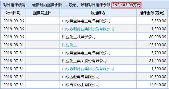 據公開數據顯示,玉皇化工對外擔保余額為19.5億,其中對洪業化工及其子公司的擔保余額為8億,在玉皇化工所有擔保企業中占比最高。