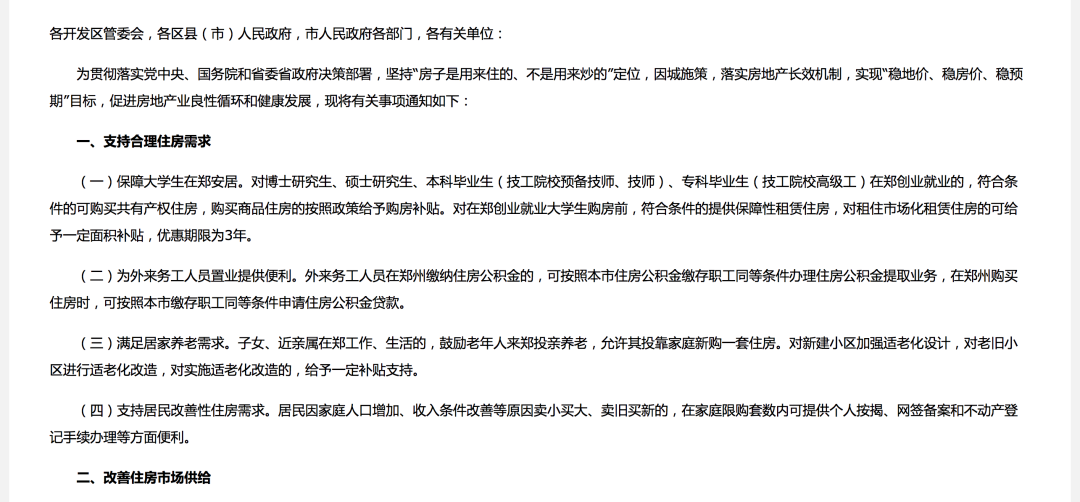 1.有針對性取消限購,允許部分家庭新購一套住房。對子女、近親屬在鄭工作、生活的,鼓勵老年人來鄭投親養老,允許其投靠家庭新購一套住房。