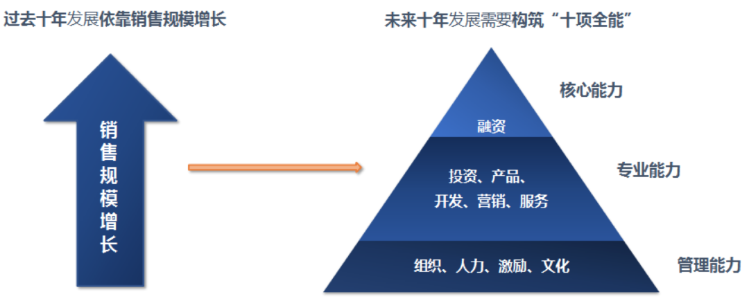 第二,企業(yè)經(jīng)營(yíng)戰(zhàn)略、經(jīng)營(yíng)理念、經(jīng)營(yíng)模式隨行業(yè)發(fā)展而轉(zhuǎn)變是績(jī)效管理調(diào)整的直接原因。房地產(chǎn)行業(yè)新的時(shí)代背景下,房企也從過去銷售“一枝獨(dú)秀”逐漸過渡到需要構(gòu)建“十項(xiàng)全能”的能力。