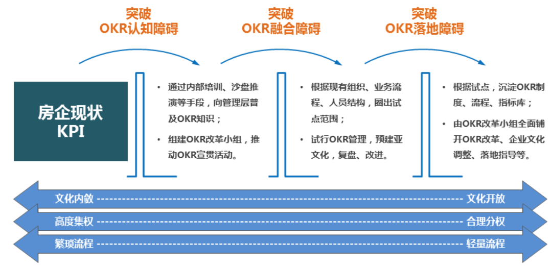 從OKR適用的輕量化組織、注重效率的運(yùn)作機(jī)制來看,最適配于房企落地與推動(dòng)的方案,應(yīng)該是漸進(jìn)式、雙軌制融合的方式。一方面是保持原有的績(jī)效管理如KPI模式,另一方面在部分試點(diǎn)單元或職能中逐步開始推動(dòng)OKR。例如人力資源、行政部門難以量化的工作較多,因此可以先行試點(diǎn)。