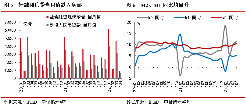 4月社融信貸跌入底部,主因是疫情影響,預(yù)計4月就是數(shù)據(jù)的底部。隨著上海疫情好轉(zhuǎn),復(fù)工復(fù)產(chǎn)的持續(xù)進行,后續(xù)疫情對經(jīng)濟的沖擊逐漸減弱,社融將逐步回歸。當前消費和地產(chǎn)處于低谷,消費隨著疫情和城市解封會逐步恢復(fù);地產(chǎn)的低谷持續(xù)了較長時間,今年以來全國100多個城市的放松政策并未對地產(chǎn)形成有效的拉升,我們認為后續(xù)地產(chǎn)需繼續(xù)因城施策,加大放松力度。