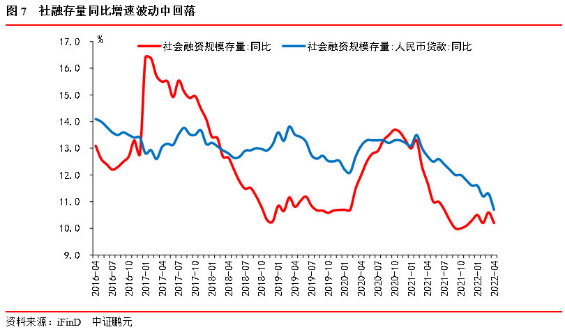 表內(nèi)融資受阻是最主要拖累因素:4月社融口徑的新增人民幣貸款3,616億元,同比少增9,224億元,是2009年12月以來的社融口徑新增人民幣貸款的最低值,表內(nèi)信用嚴重拖累社融增量。