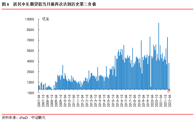 居民端:短期貸款同比少增,疫情頻發(fā)影響下居民貸款和和消費信心和意愿不足;中長期貸款當月值繼2月突破歷史負值后再次達到負值。居民貸款減少2,170億元,同比少增7,453億元。居民短期貸款減少1,856億元,同比少增2,221億元,4月國內(nèi)疫情嚴重,抑制居民的日常消費需求與短期貸款意愿。居民中長期貸款減少313.72億元,同比少增5,231億元,繼2月單月值達到歷史負值后,4月再次達到歷史負值,主因商品房銷售疲弱,居民信貸弱,按揭貸款不足,房地產(chǎn)低迷。4月住房貸款減少605億元,同比少增4,022億元,拖累居民信貸接近一半。