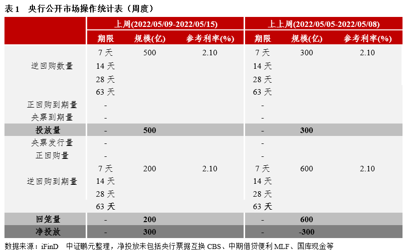 上周(2022/05/09-2022/05/15)央行7天逆回購?fù)斗?00億元,7天逆回購到期200億元,合計凈投放300億元。上周多空交織,債市主要交易社融數(shù)據(jù),債券收益率震蕩。當前疫情拐點已現(xiàn),上海疫情逐步好轉(zhuǎn)且復(fù)工復(fù)產(chǎn)在持續(xù)推進、北京疫情仍處于波動中但新增感染人數(shù)并未出現(xiàn)大幅增加,疫情的影響雖然在持續(xù)但逐漸消化,重點關(guān)注穩(wěn)增長政策的加碼和落地效果。貨幣政策繼續(xù)保持穩(wěn)健,整體流動性合理充裕,總量的降息可能性較小(降低MLF和7天逆回購利率),主要掣肘于通脹和國外加息,5月LPR單邊調(diào)低的可能性極大。