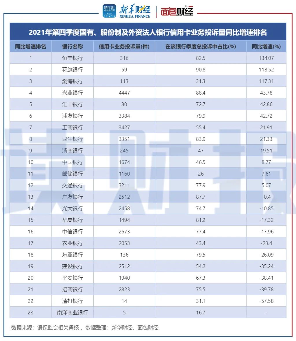 從2021年第四季度的同比增速來看,恒豐銀行和渤海銀行位居股份制銀行前兩位。但是,這主要是由于兩家銀行去年基數較低造成。即便在翻倍增長之后,2021年四季度兩家銀行的信用卡業務投訴量合計仍不超過500件。