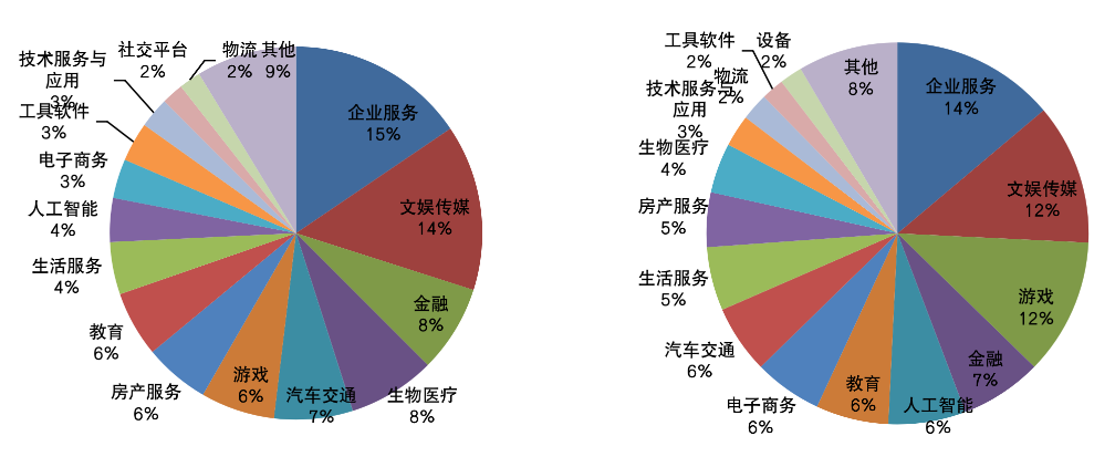 圖:七家互聯網巨頭2019年(左)和2020年(右)投資數量的行業分布