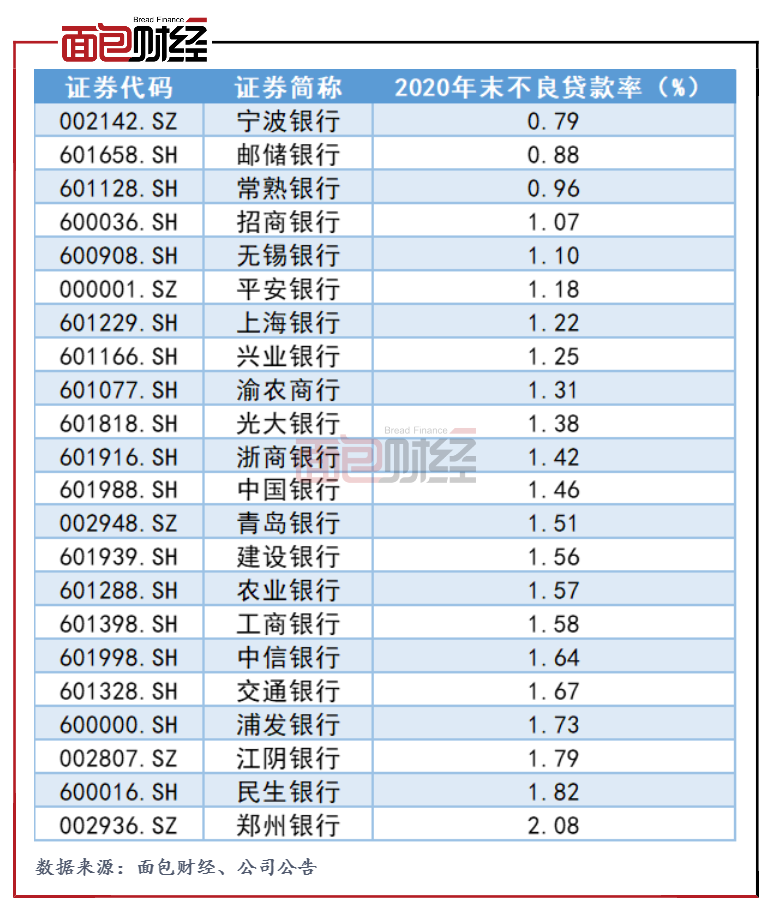 在當前已經發布年報的城商行中,上海銀行不良率位居第二低,明顯低于國有行和大部分股份制商業銀行。