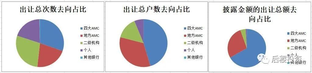 從出讓去向上看,四大AMC和地方AMC的總次數(shù)和總戶數(shù)相近,但總金額上,四大AMC占了將近70%,這是因為四大跟國有六大行的業(yè)務聯(lián)系更密切,而自然人和二級機構雖然也從銀行直接受讓債權,但因監(jiān)管原因通常以單戶債權為主,故總金額占比較小。銀行出讓至四大AMC的債權總額為2646億,出讓至地方AMC的債權總額為1098億元,由此推測出目前四大AMC和地方AMC在銀行債權出讓一級市場的受讓比例大約為7:3。