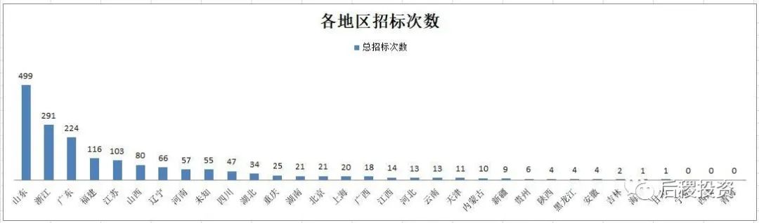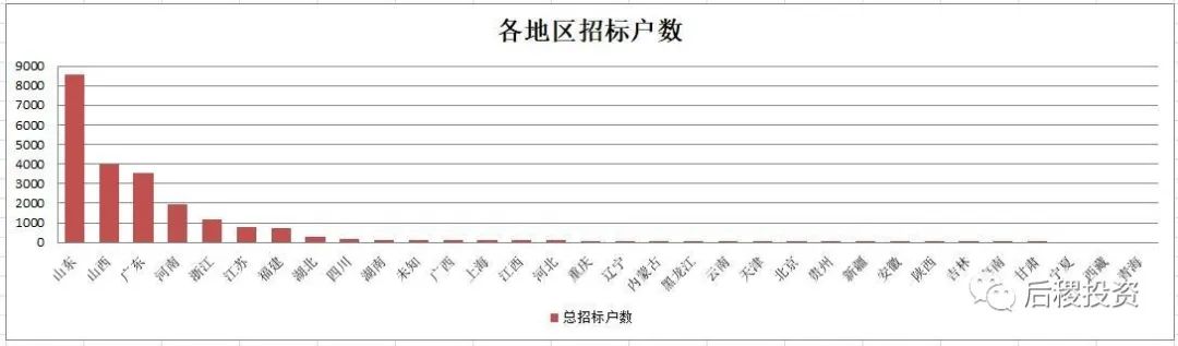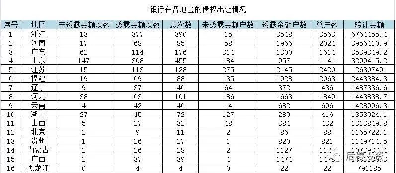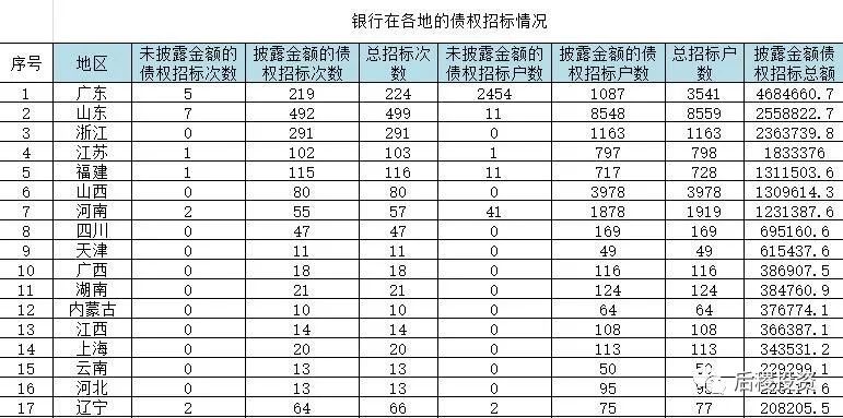 銀行招標次數(shù)前五的省份是山東、浙江、廣東、福建和江蘇,戶數(shù)前五的省份是山東、山西、廣東、河南和浙江,而披露的金額前五的省份是廣東、山東、浙江、江蘇和福建,山西和河南排第六和第七。總體來說除傳統(tǒng)成交活躍大省外,河南和山西等中部地區(qū)省份的銀行的債權招標力度也較大。