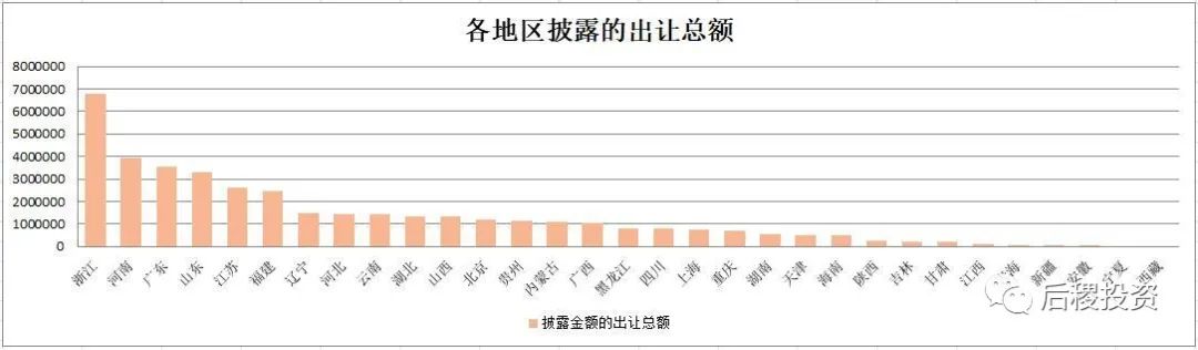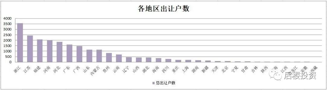 從上圖看,銀行出讓成交次數(shù)前五的省份是山東、浙江、廣東、江蘇和河北;戶數(shù)前五的省份是浙江、江蘇、福建、河南和河北,廣東排第六;而出讓總額排名前五的省份是浙江、河南、廣東、山東和江蘇,福建、遼寧、河北、山西緊隨其后,較其他地區(qū)為高。仍舊可以看出東部地區(qū)省份,銀行的出讓力度較其他地區(qū)為高,當然這也與我國的經(jīng)濟總量分布有關。