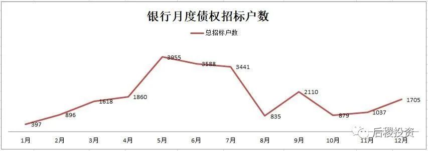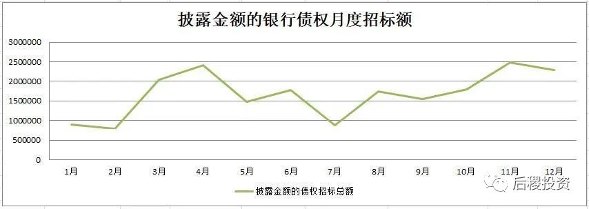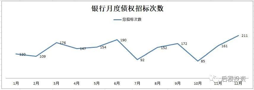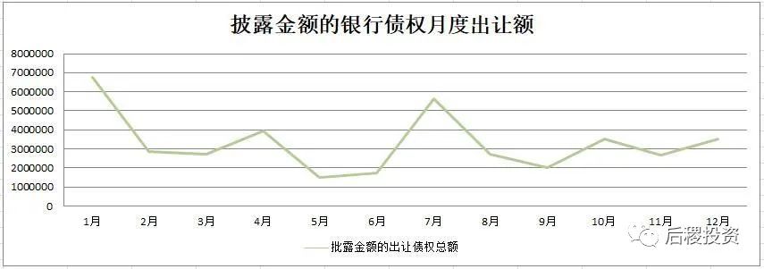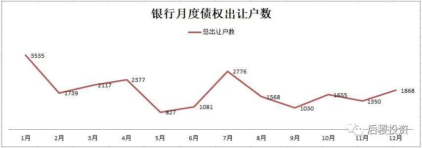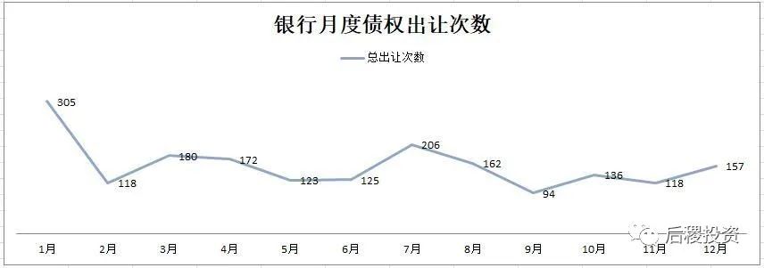 除1月外,銀行月度出讓次數(shù)曲線的區(qū)間為94-206次,區(qū)間中值為150次左右,戶數(shù)區(qū)間為827-2776戶,區(qū)間中值為1800戶左右,而月度出讓成交金額的區(qū)間中值則為350億元左右。1月和7月是公告成交的高峰期,這與業(yè)務規(guī)律也契合。