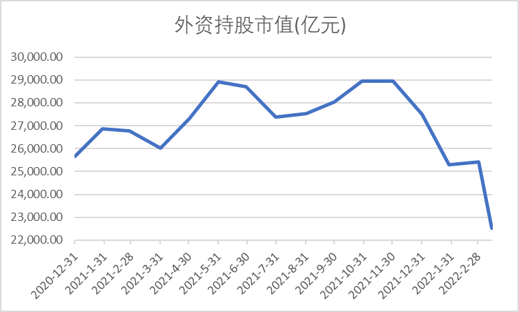 可能是出于對地緣政治擔憂,外資增持A股的趨勢在2021年5月戛然而止,之后便步入了減持通道,持股市值從最高峰的2.8萬億元下降到現在的2.2萬億元。