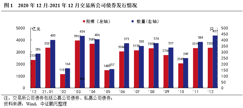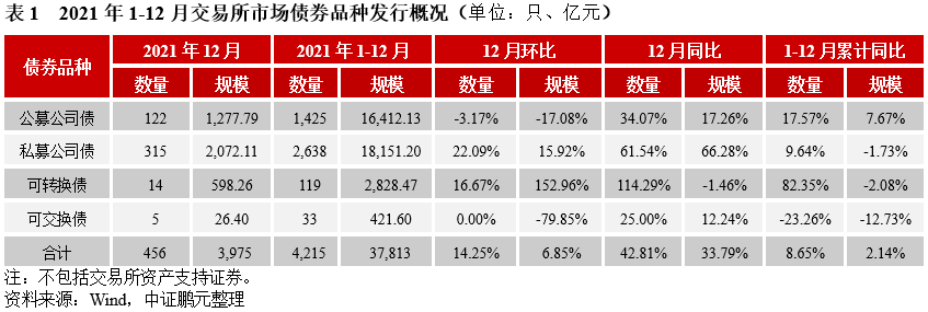 2021年12月份,我國交易所市場共發行信用債券456只,發行規模3,975億元;發行數量和規模環比分別上升14%和7%,私募公司債本月發行較多。